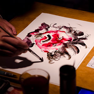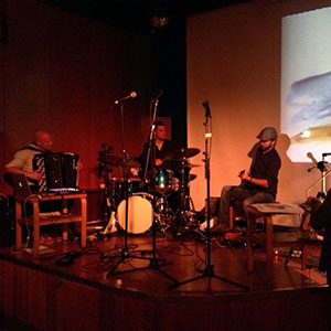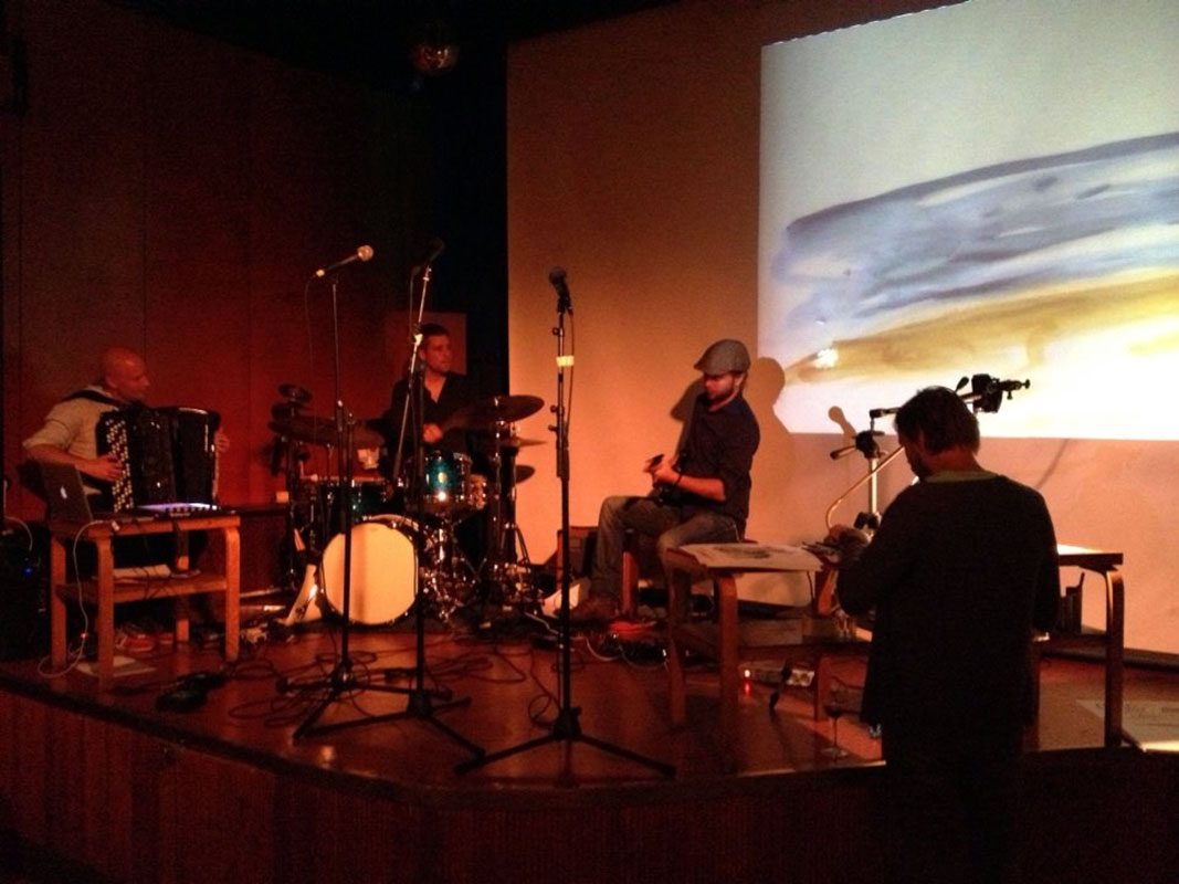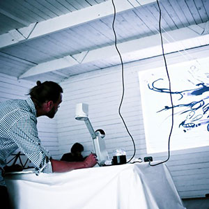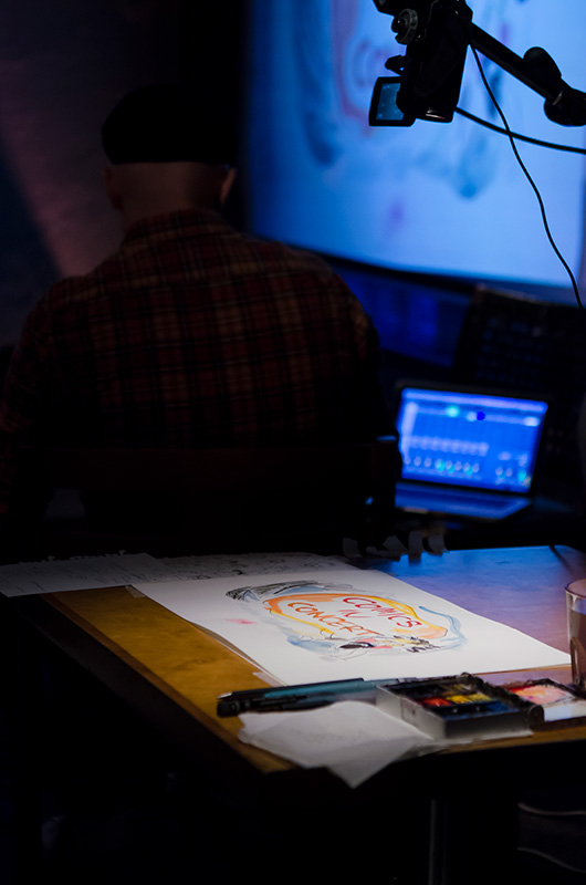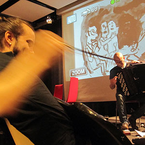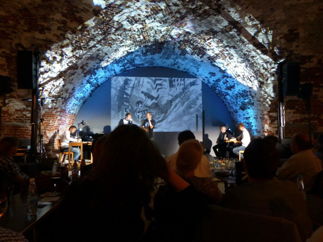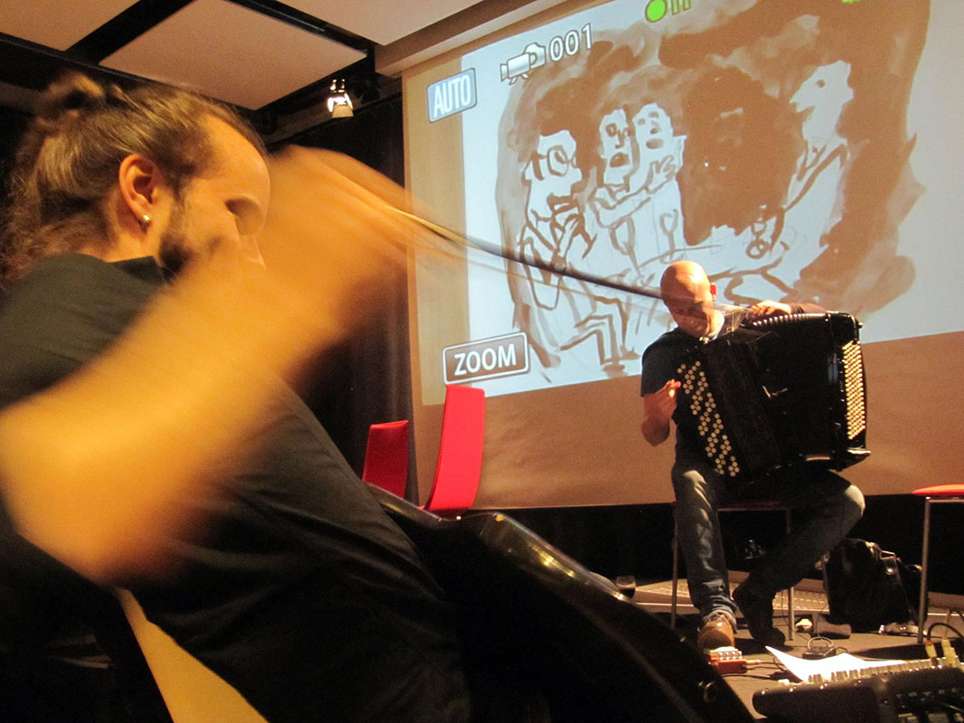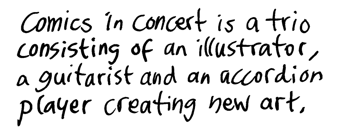 Since 2009 the Comics in Concert trio has been taking its magical combination of music and drawing to festivals, concert halls, art fairs and other public and private events across Finland and Sweden, to Germany, England, Switzerland and United States. It has performed for example in the Finnish Museum of Contemporary Art Kiasma, the comics festival MOCCA in New York and the jazz festival Viapori Jazz in Helsinki.